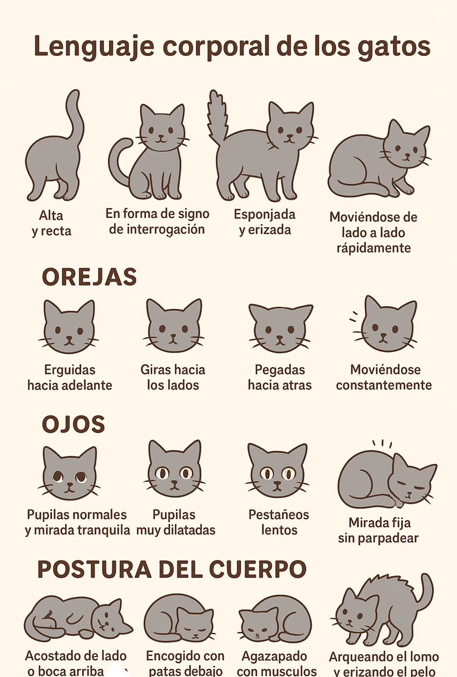 ¡Es muy buena pregunta! 🐾 Entender a los gatos es como aprender un idioma: ellos hablan con su cuerpo, sonidos y rutinas. Aquí te dejo una forma sencilla de interpretarlos: